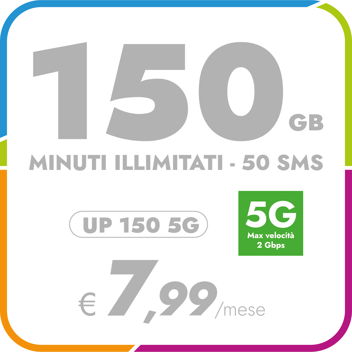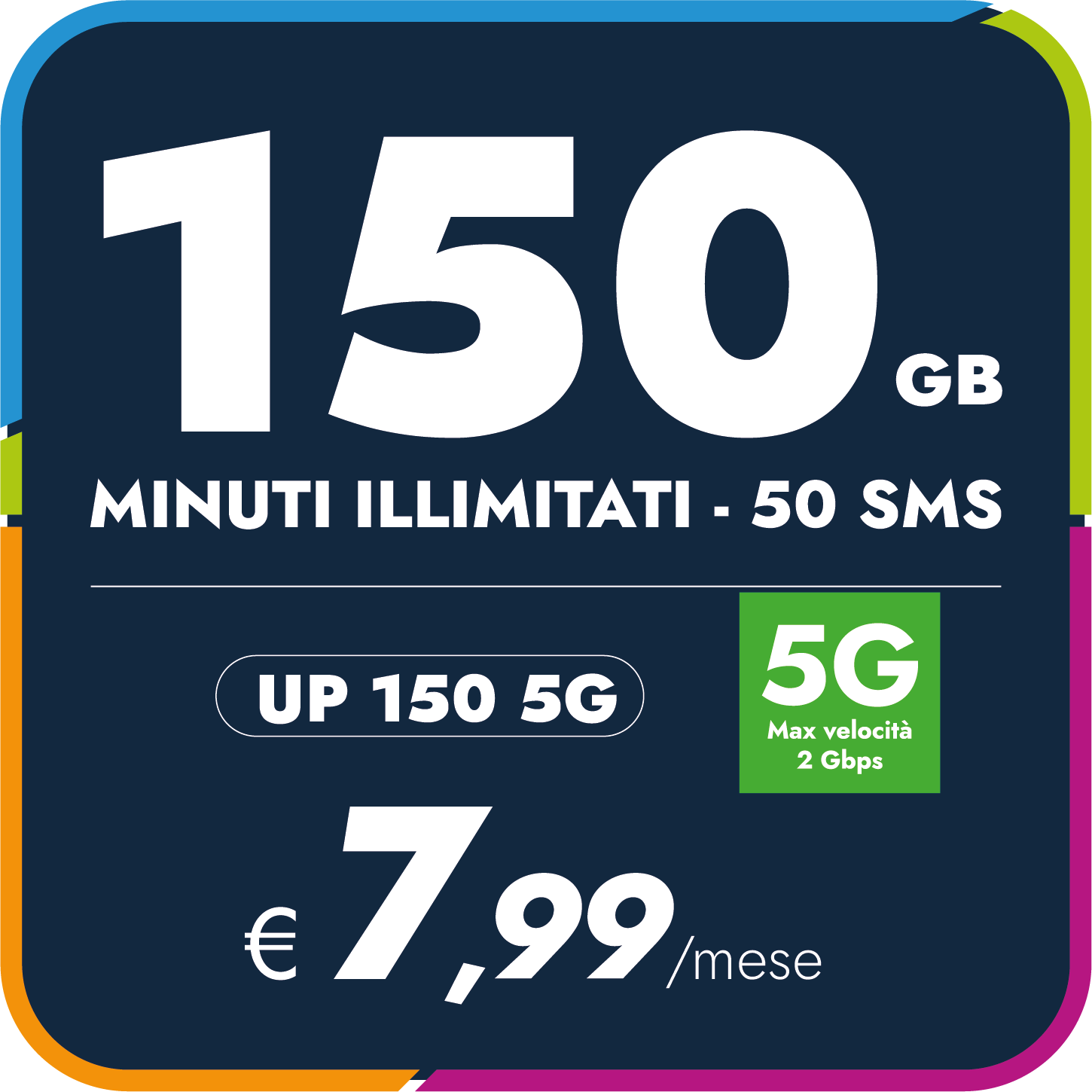 Con UP 150 5G chiami senza scatto alla risposta e navighi in 5G con una velocità in download fino a 2.000 Mbps, e in upload fino a 200 Mbps sul territorio nazionale con scatti anticipati di 1MB.